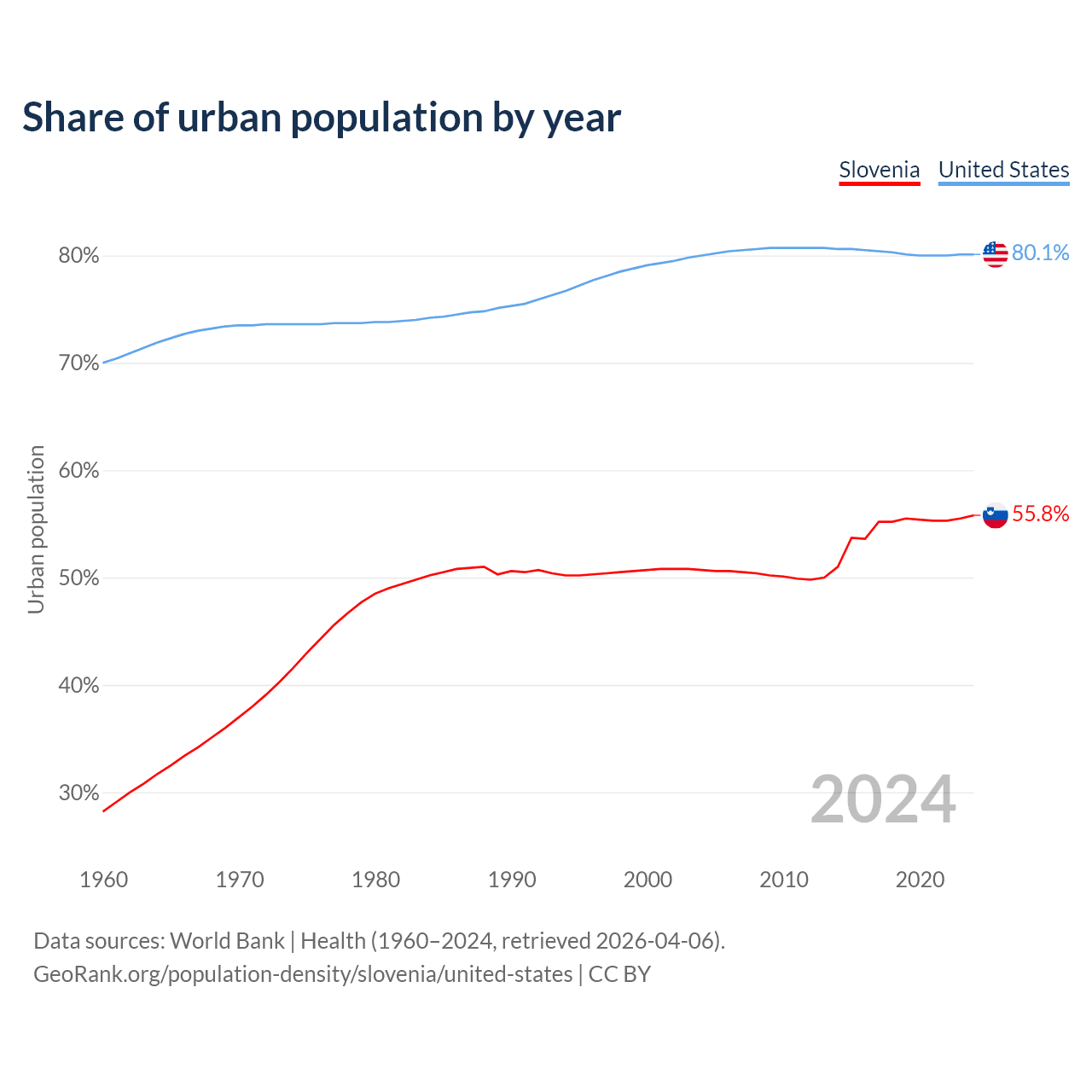 From 2004 to 2024, the share of urban population changed from 50.7% to 55.8% in Slovenia and from 80% to 80.1% in the United States.