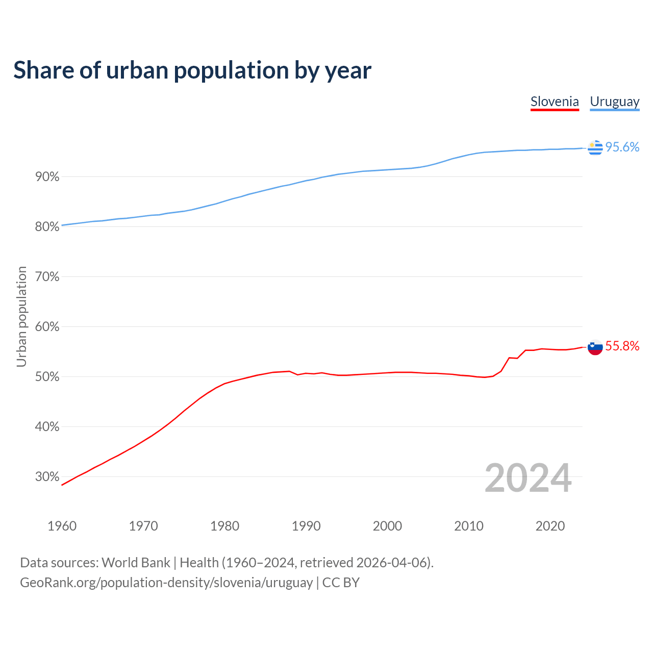From 2004 to 2024, the share of urban population changed from 50.7% to 55.8% in Slovenia and from 91.8% to 95.6% in Uruguay.
