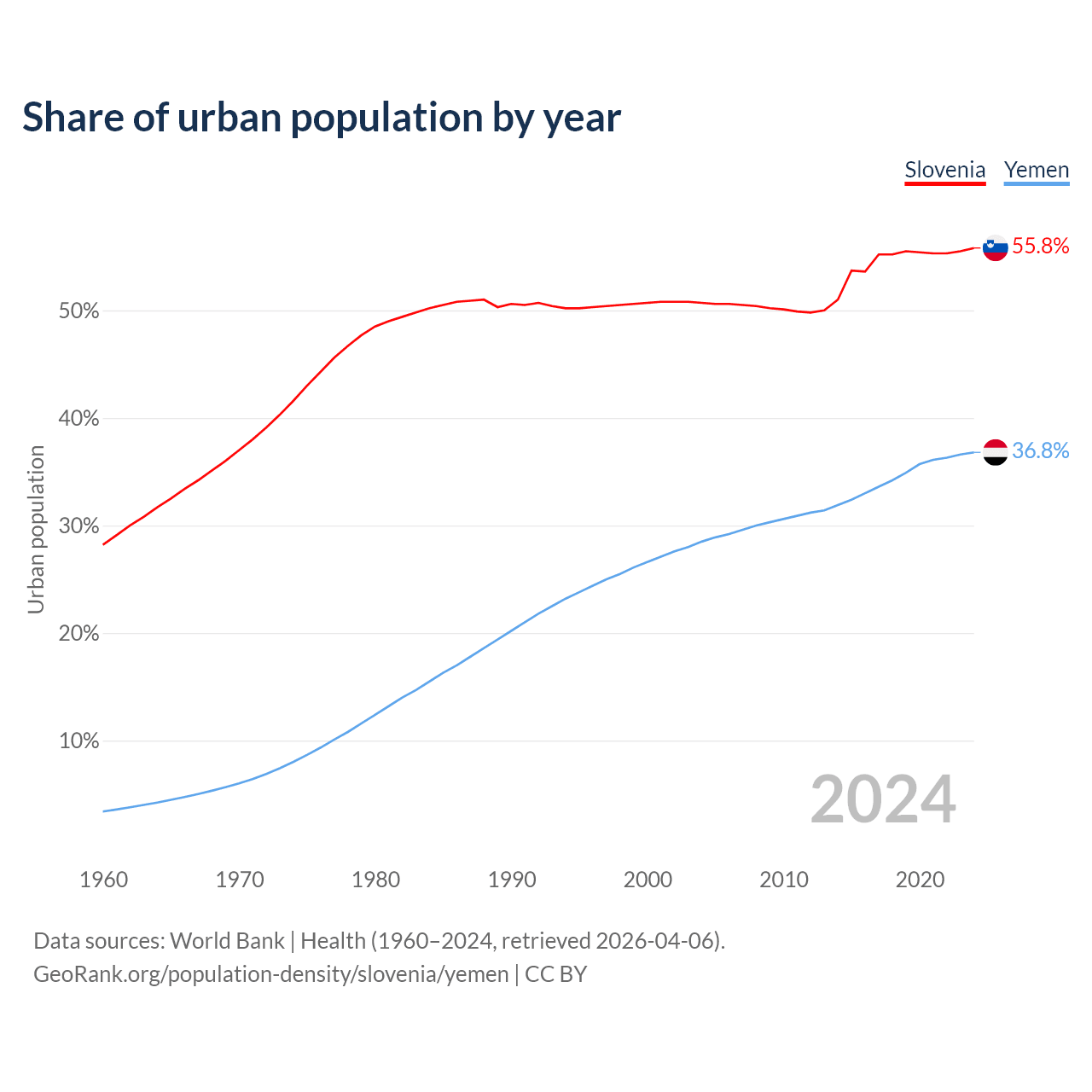 From 2004 to 2024, the share of urban population changed from 50.7% to 55.8% in Slovenia and from 28.5% to 36.8% in Yemen.
