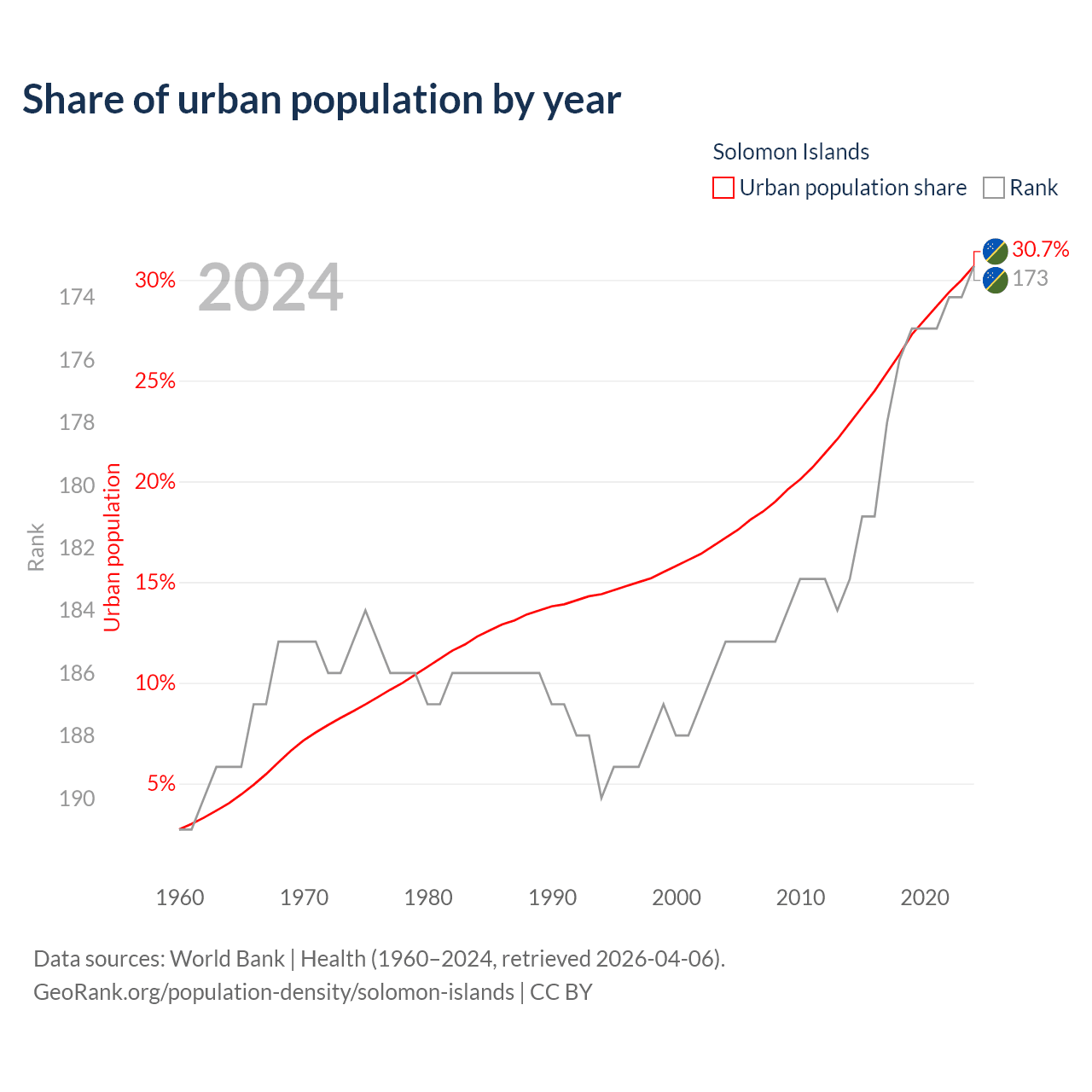 This chart shows how population density in the Solomon Islands has changed over time. From 2006 to 2026, population density increased by 74.6%. The Solomon Islands ranked 161st by population density 20 years ago and ranks 155th today.