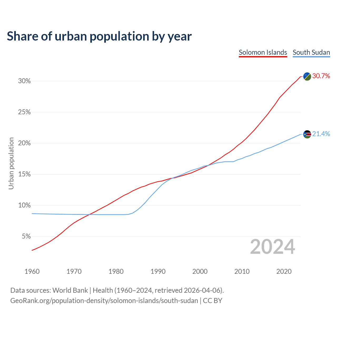 From 2004 to 2024, the share of urban population changed from 17.2% to 30.7% in the Solomon Islands and from 16.8% to 21.4% in South Sudan.