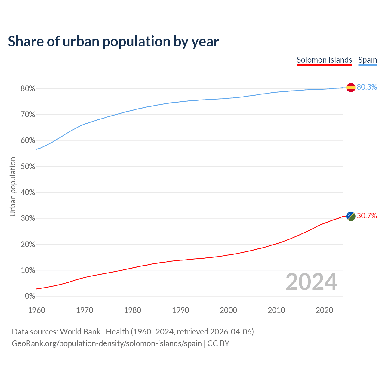 From 2004 to 2024, the share of urban population changed from 17.2% to 30.7% in the Solomon Islands and from 77% to 80.3% in Spain.