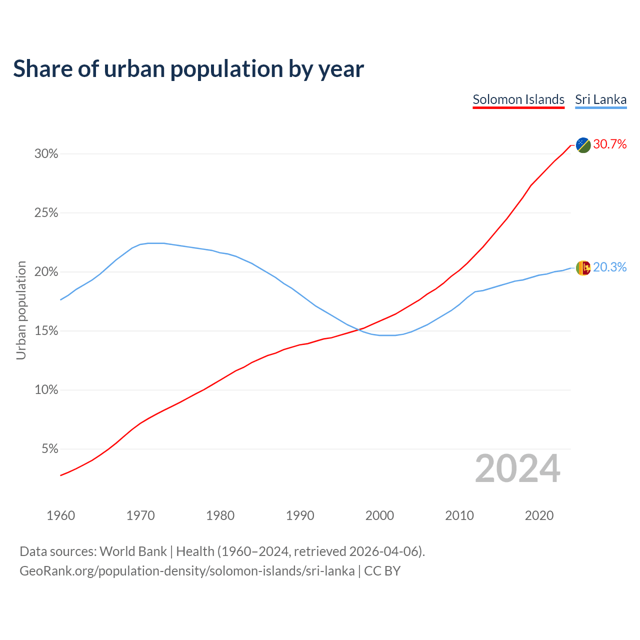 From 2004 to 2024, the share of urban population changed from 17.2% to 30.7% in the Solomon Islands and from 14.9% to 20.3% in Sri Lanka.