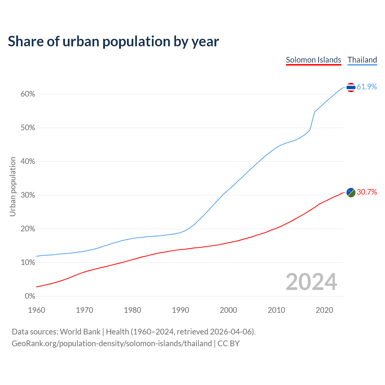 From 2004 to 2024, the share of urban population changed from 17.2% to 30.7% in the Solomon Islands and from 36.8% to 61.9% in Thailand.