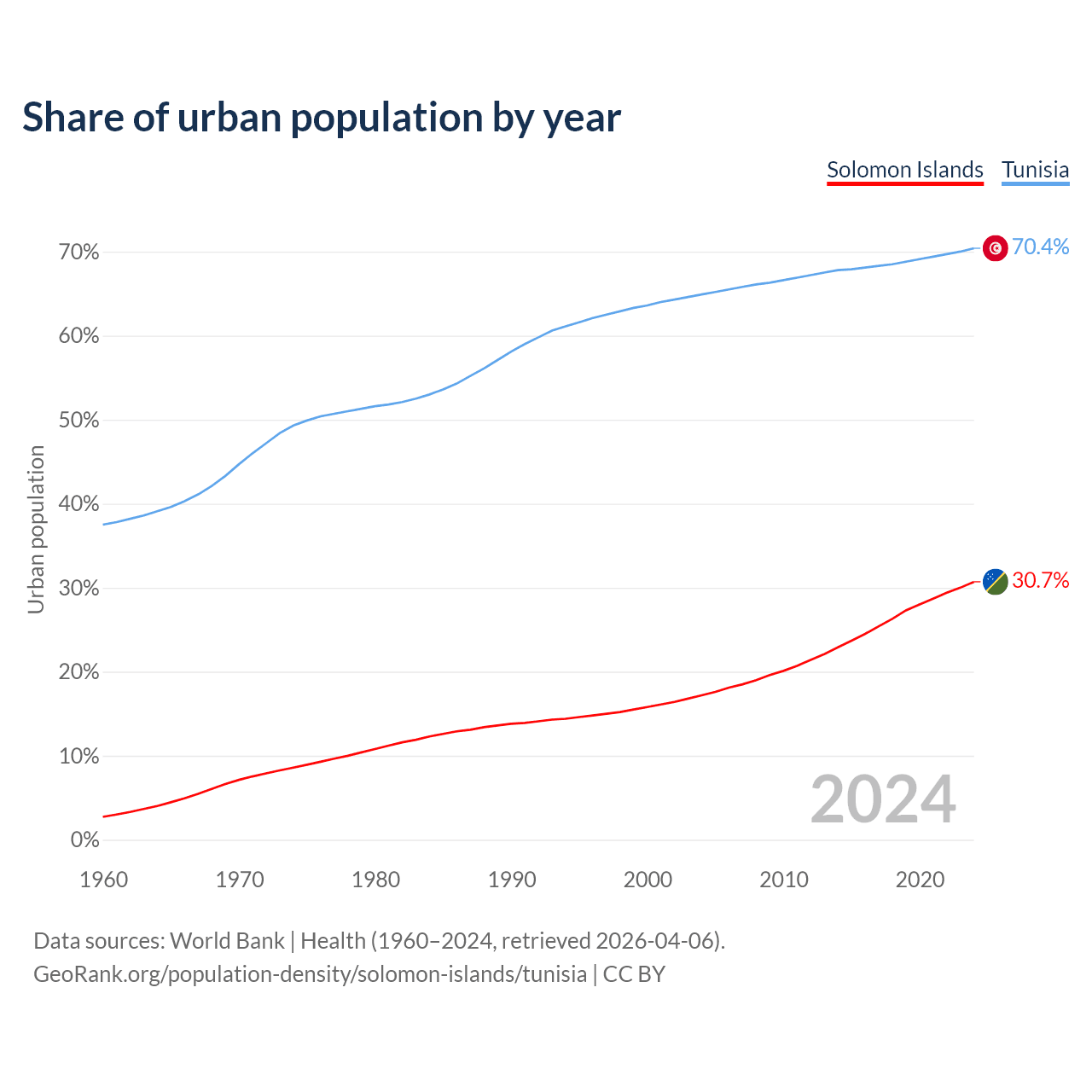 From 2004 to 2024, the share of urban population changed from 17.2% to 30.7% in the Solomon Islands and from 64.9% to 70.4% in Tunisia.