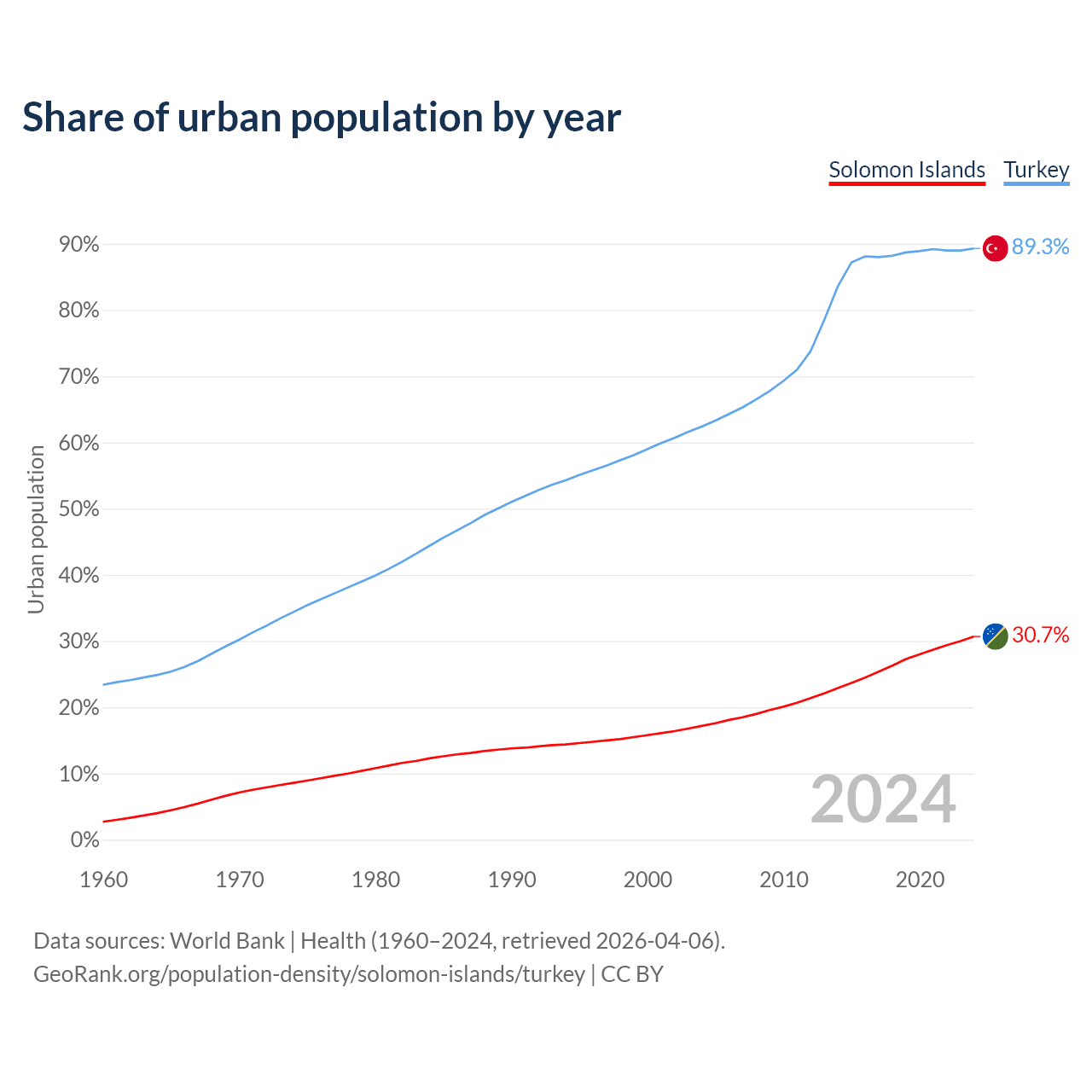 From 2004 to 2024, the share of urban population changed from 17.2% to 30.7% in the Solomon Islands and from 62.4% to 89.3% in Turkey.