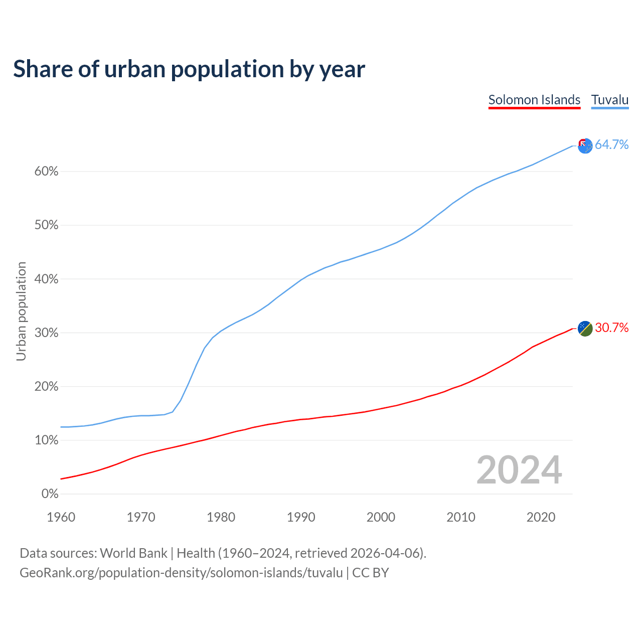 From 2004 to 2024, the share of urban population changed from 17.2% to 30.7% in the Solomon Islands and from 48.4% to 64.7% in Tuvalu.