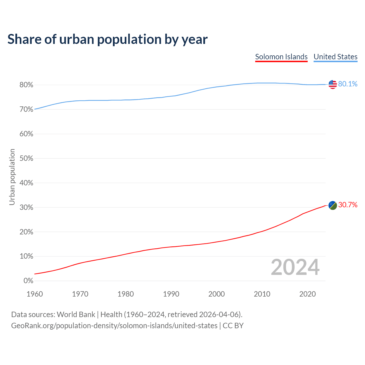 From 2004 to 2024, the share of urban population changed from 17.2% to 30.7% in the Solomon Islands and from 80% to 80.1% in the United States.