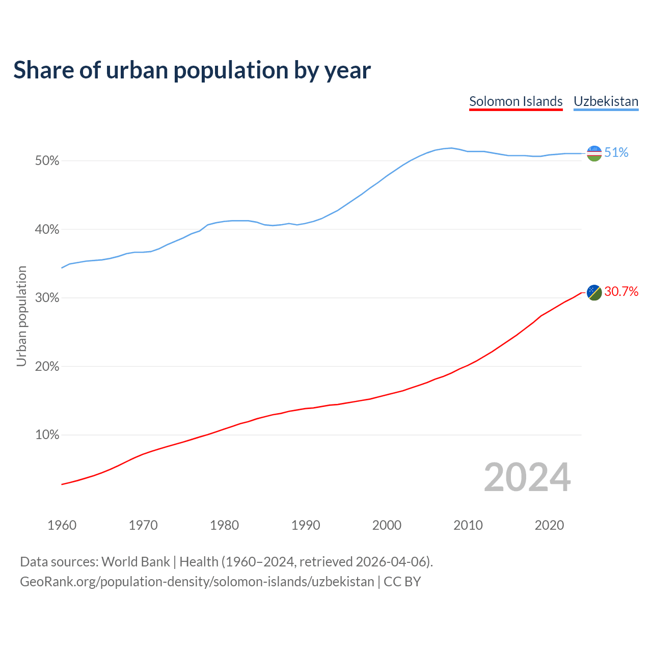 From 2004 to 2024, the share of urban population changed from 17.2% to 30.7% in the Solomon Islands and from 50.6% to 51% in Uzbekistan.