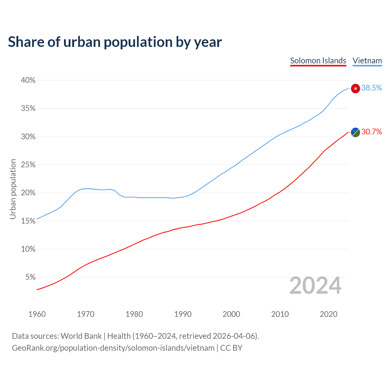 From 2004 to 2024, the share of urban population changed from 17.2% to 30.7% in the Solomon Islands and from 26.8% to 38.5% in Vietnam.