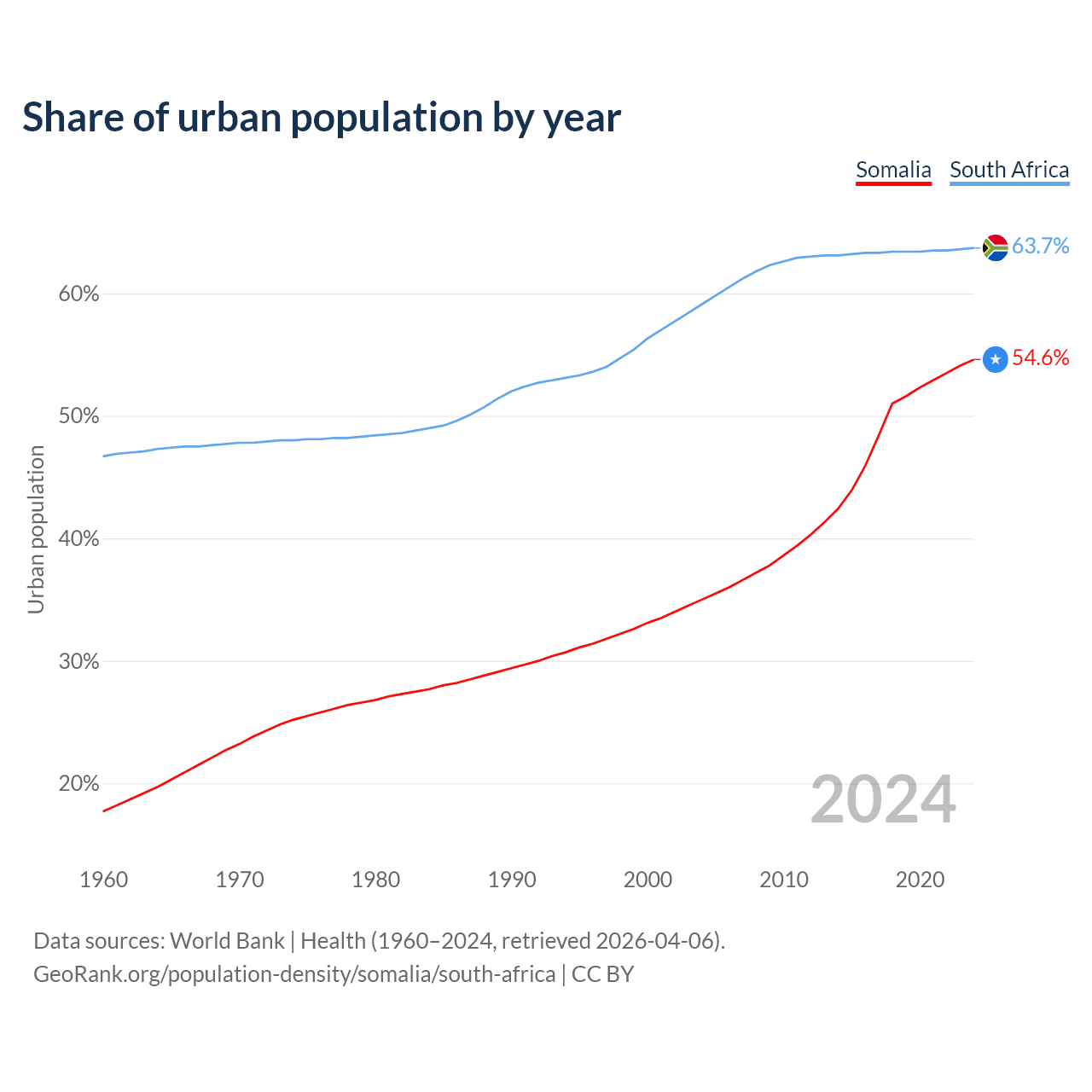 From 2004 to 2024, the share of urban population changed from 35% to 54.6% in Somalia and from 59.1% to 63.7% in South Africa.