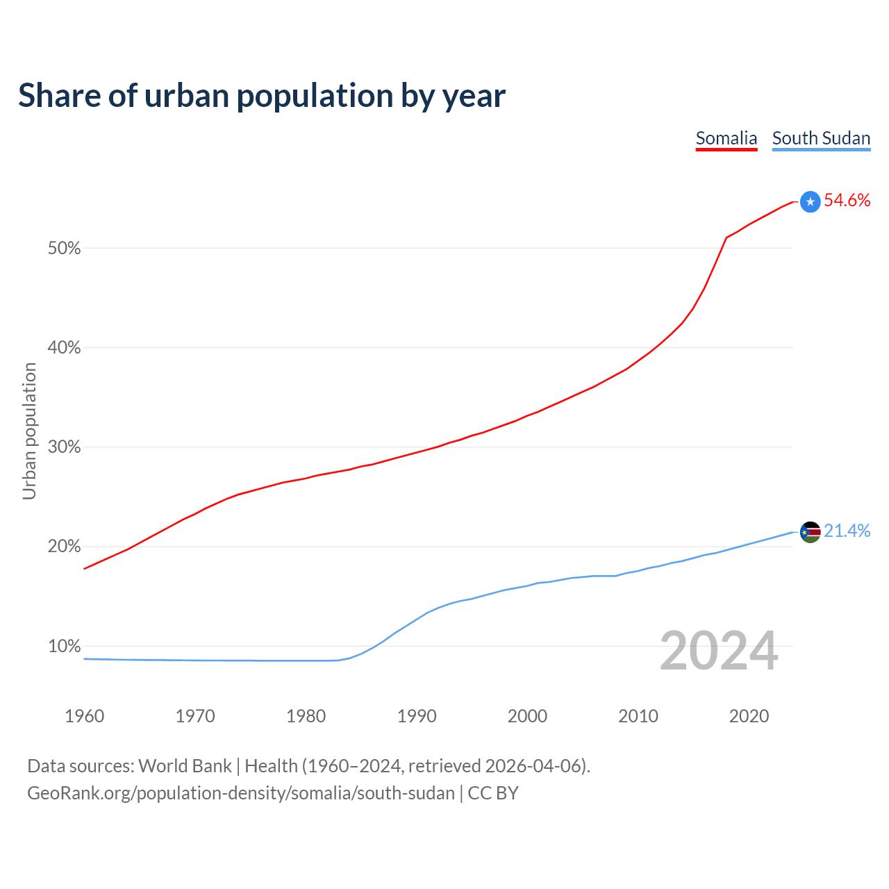 From 2004 to 2024, the share of urban population changed from 35% to 54.6% in Somalia and from 16.8% to 21.4% in South Sudan.