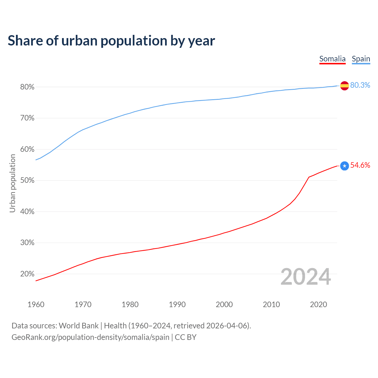 From 2004 to 2024, the share of urban population changed from 35% to 54.6% in Somalia and from 77% to 80.3% in Spain.