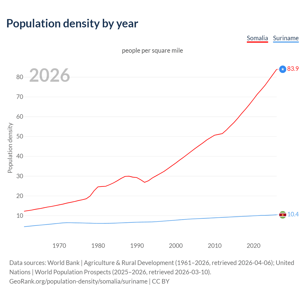 From 2006 to 2026, population density in Somalia increased by 85.2%, compared to a 22.9% growth in Suriname.