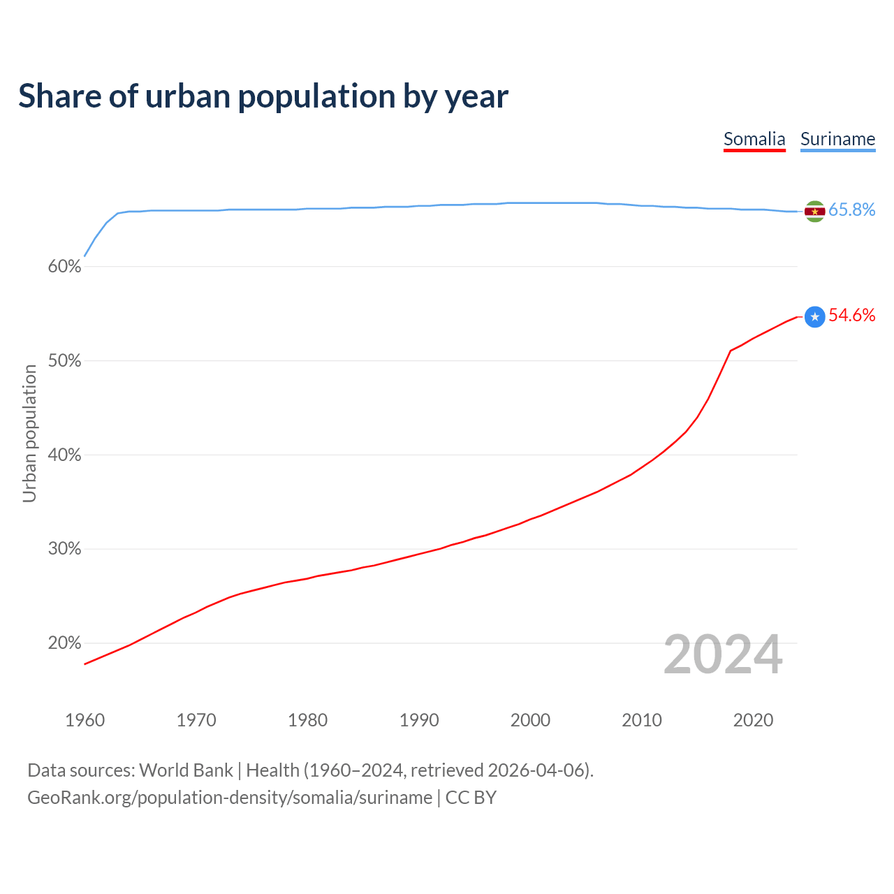 From 2004 to 2024, the share of urban population changed from 35% to 54.6% in Somalia and from 66.7% to 65.8% in Suriname.