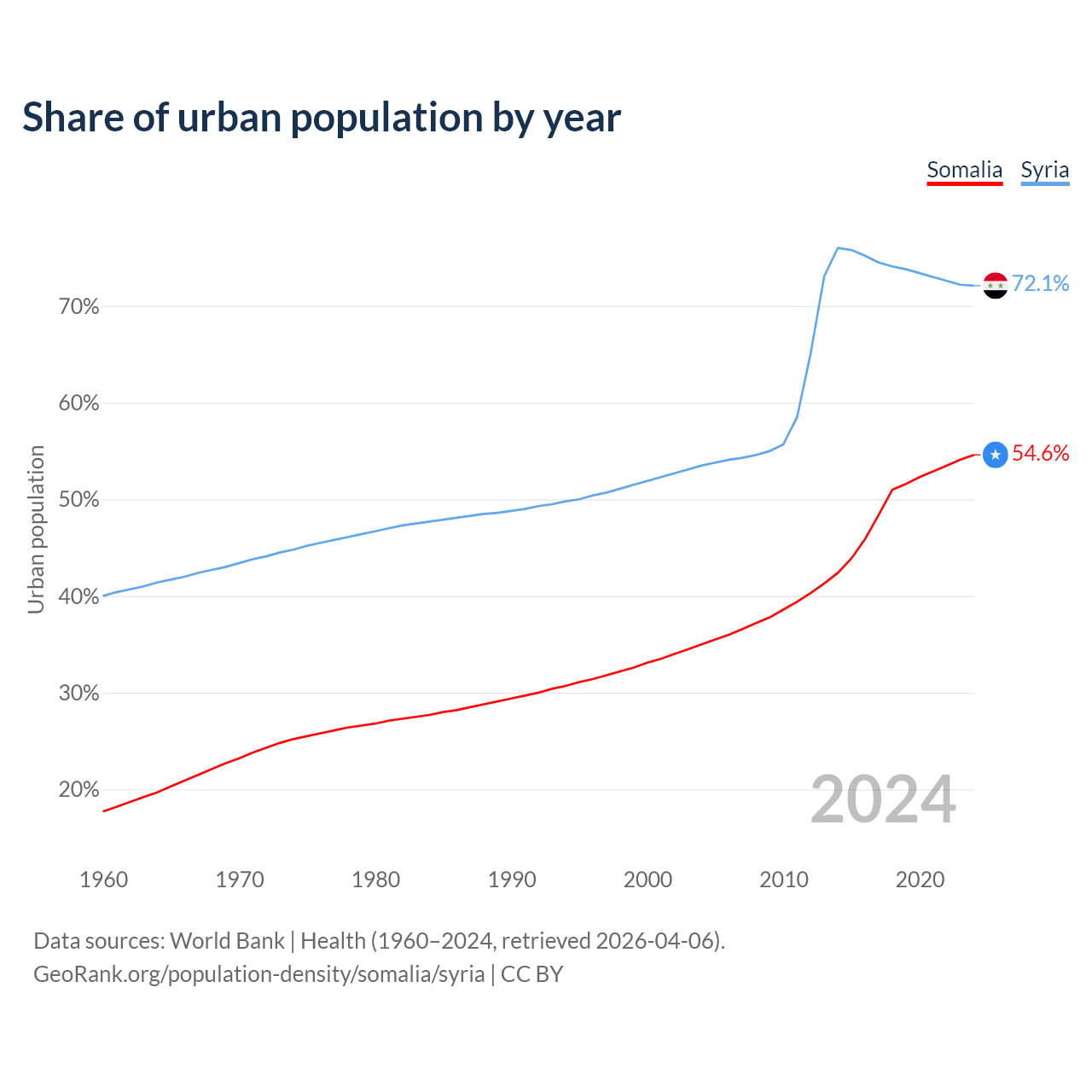 From 2004 to 2024, the share of urban population changed from 35% to 54.6% in Somalia and from 53.5% to 72.1% in Syria.