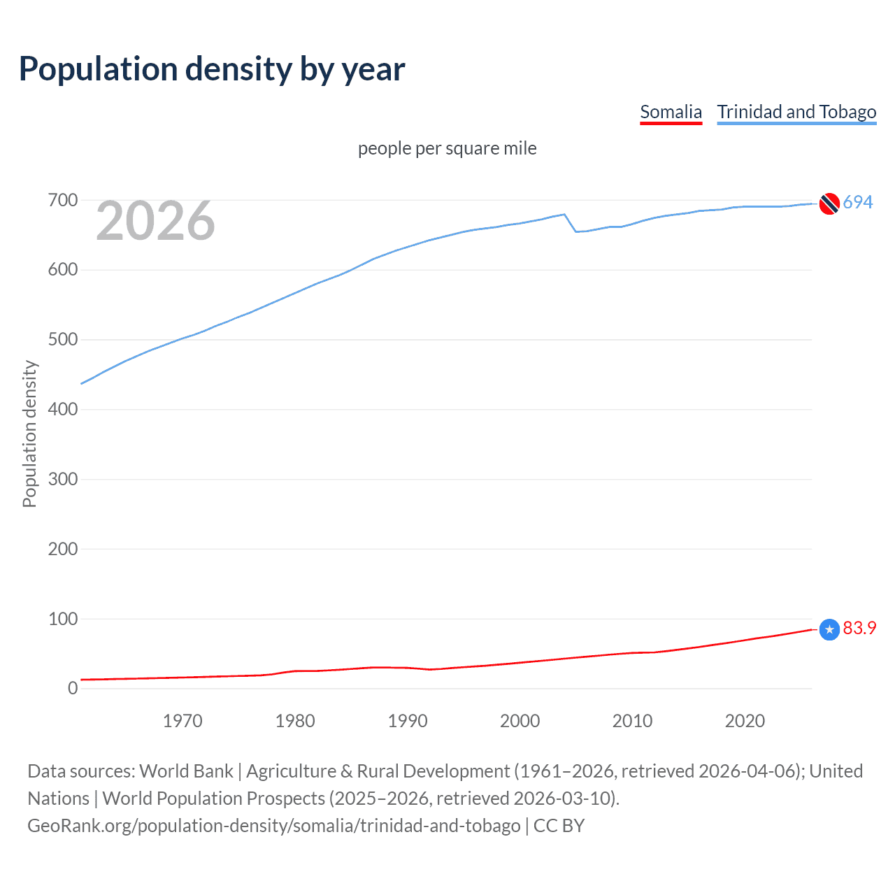 From 2006 to 2026, population density in Somalia increased by 85.2%, compared to a 5.9% growth in Trinidad and Tobago.