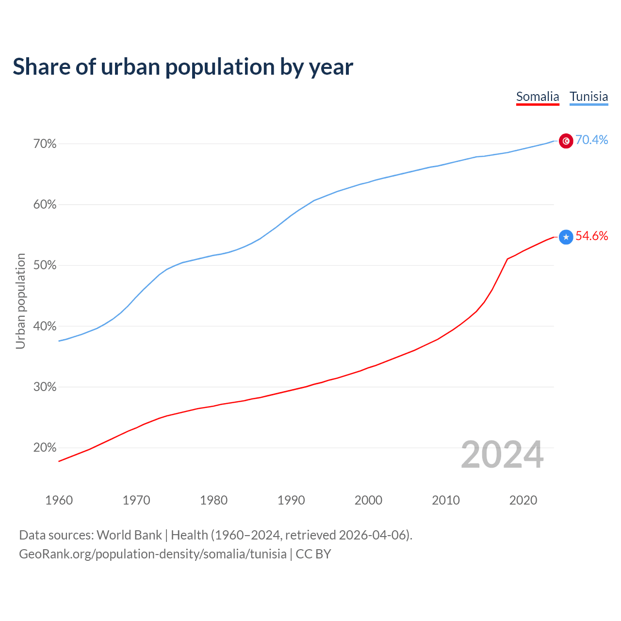 From 2004 to 2024, the share of urban population changed from 35% to 54.6% in Somalia and from 64.9% to 70.4% in Tunisia.