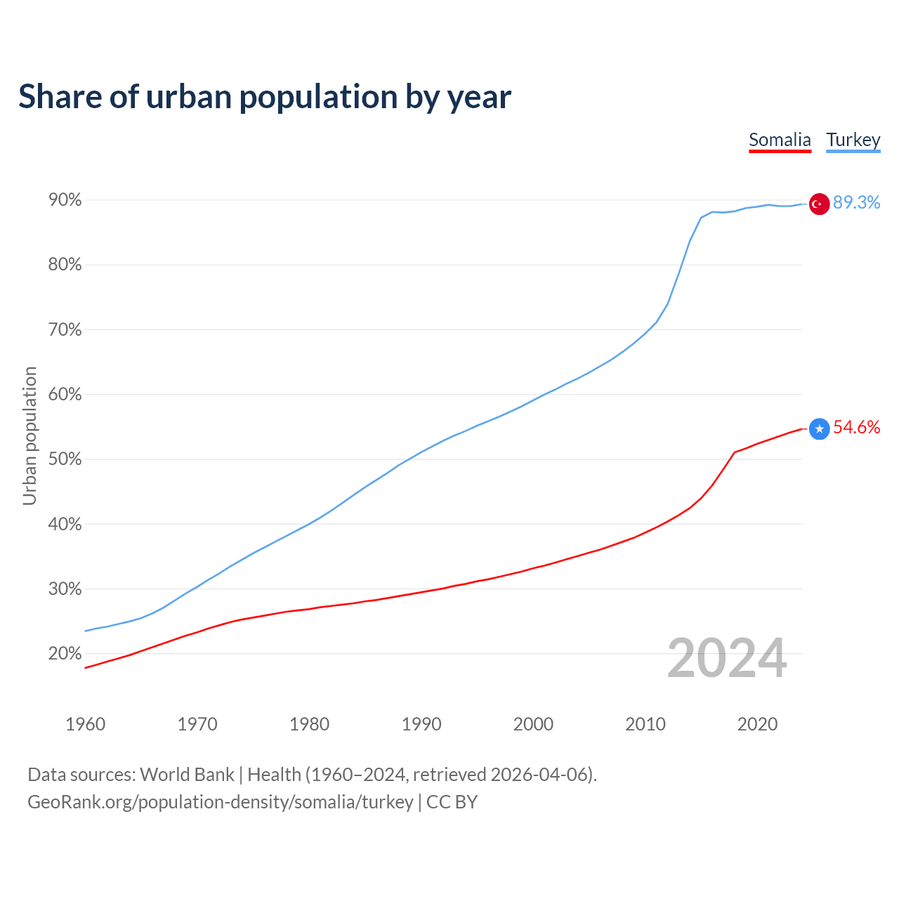 From 2004 to 2024, the share of urban population changed from 35% to 54.6% in Somalia and from 62.4% to 89.3% in Turkey.