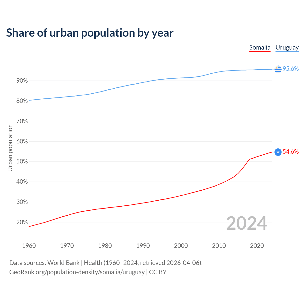 From 2004 to 2024, the share of urban population changed from 35% to 54.6% in Somalia and from 91.8% to 95.6% in Uruguay.