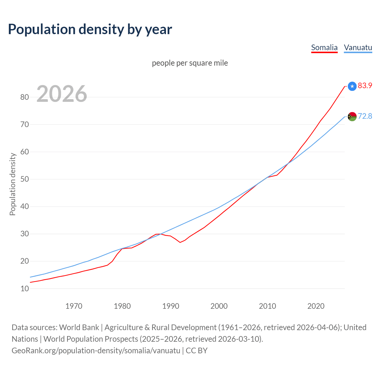 From 2006 to 2026, population density in Somalia increased by 85.2%, compared to a 58.7% growth in Vanuatu.