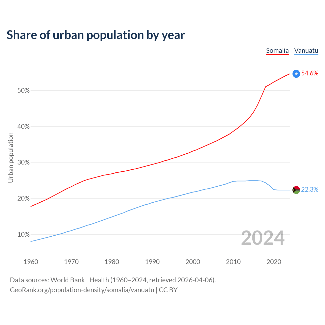 From 2004 to 2024, the share of urban population changed from 35% to 54.6% in Somalia and from 22.7% to 22.3% in Vanuatu.