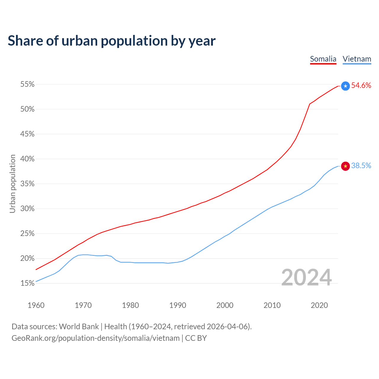 From 2004 to 2024, the share of urban population changed from 35% to 54.6% in Somalia and from 26.8% to 38.5% in Vietnam.