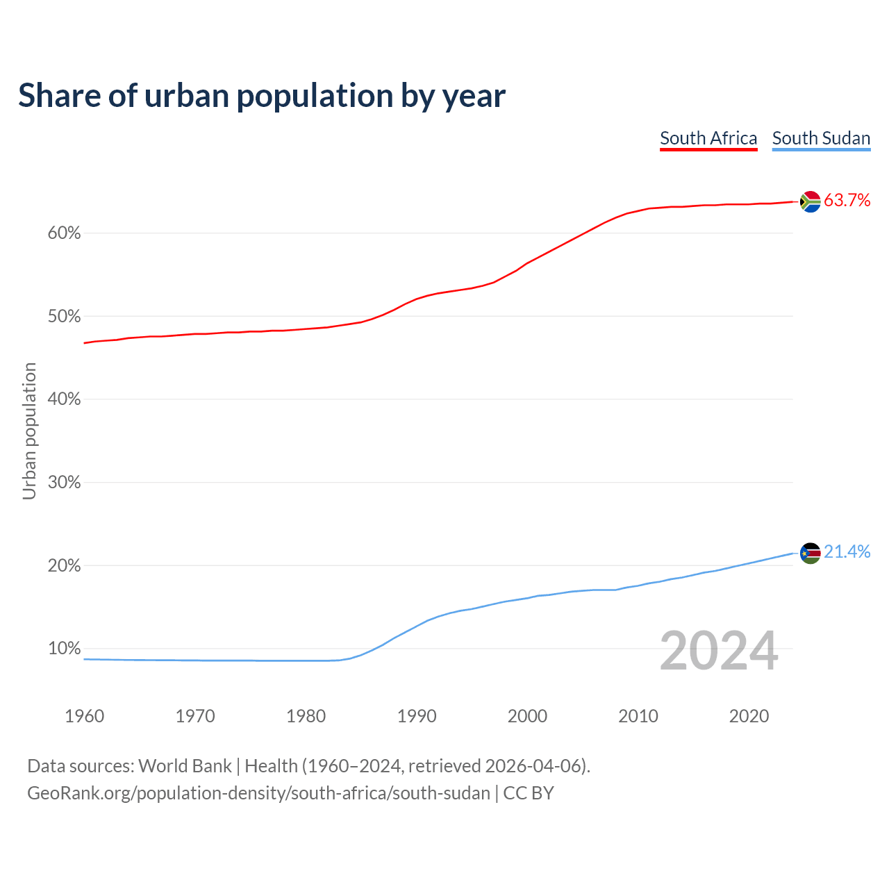 From 2004 to 2024, the share of urban population changed from 59.1% to 63.7% in South Africa and from 16.8% to 21.4% in South Sudan.