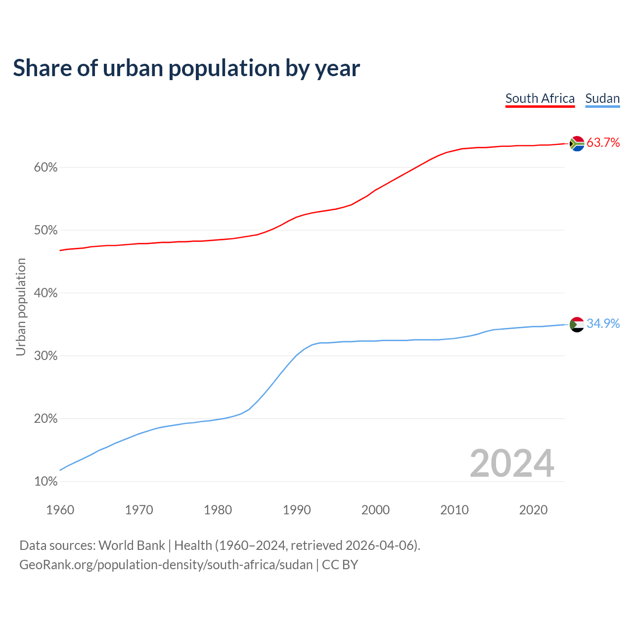 From 2004 to 2024, the share of urban population changed from 59.1% to 63.7% in South Africa and from 32.4% to 34.9% in Sudan.