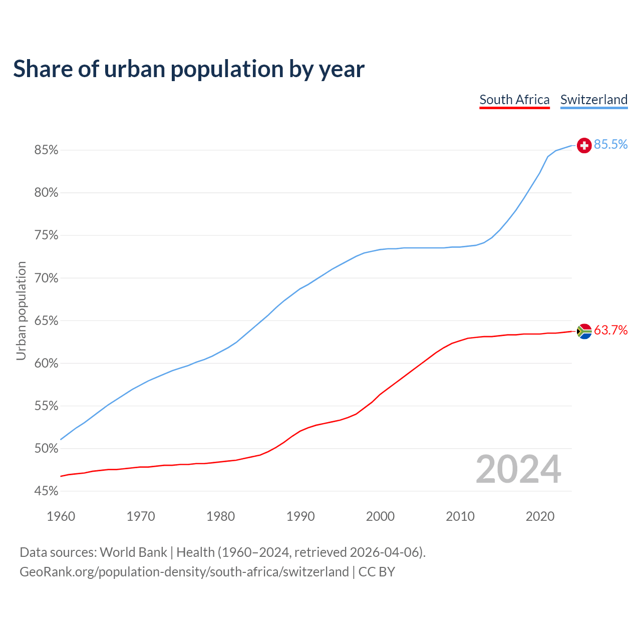 From 2004 to 2024, the share of urban population changed from 59.1% to 63.7% in South Africa and from 73.5% to 85.5% in Switzerland.