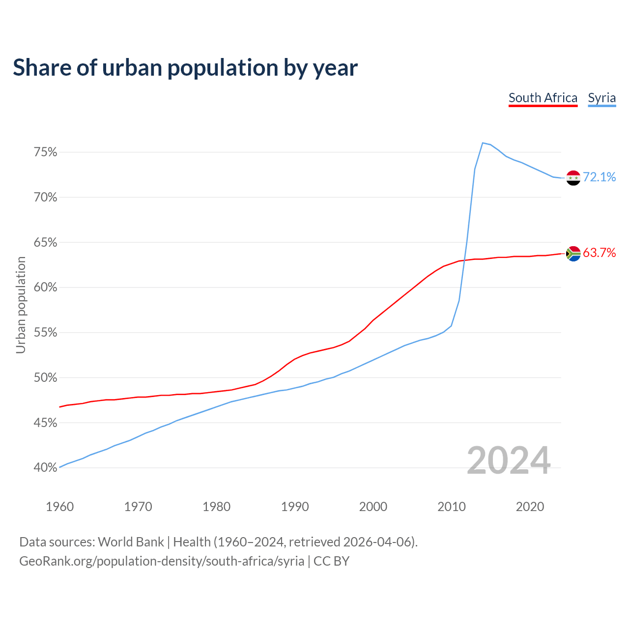 From 2004 to 2024, the share of urban population changed from 59.1% to 63.7% in South Africa and from 53.5% to 72.1% in Syria.