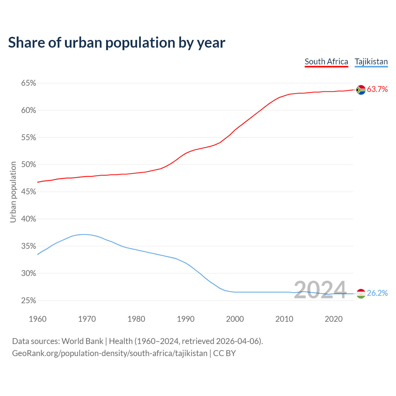 From 2004 to 2024, the share of urban population changed from 59.1% to 63.7% in South Africa and from 26.5% to 26.2% in Tajikistan.