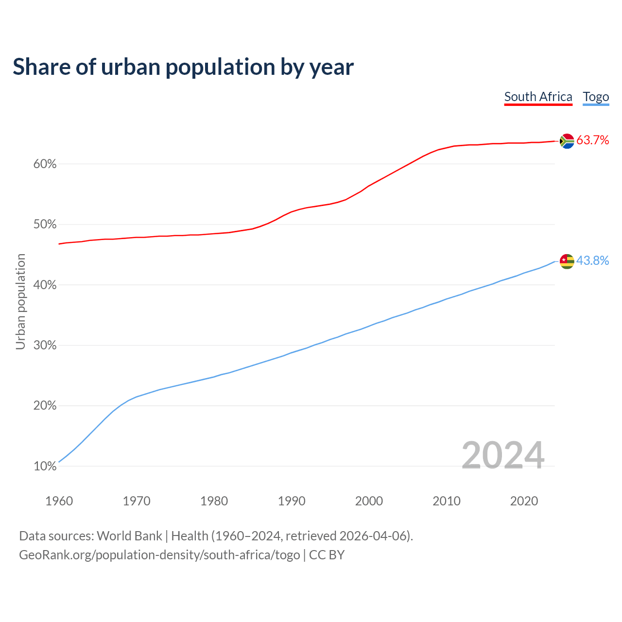 From 2004 to 2024, the share of urban population changed from 59.1% to 63.7% in South Africa and from 34.9% to 43.8% in Togo.