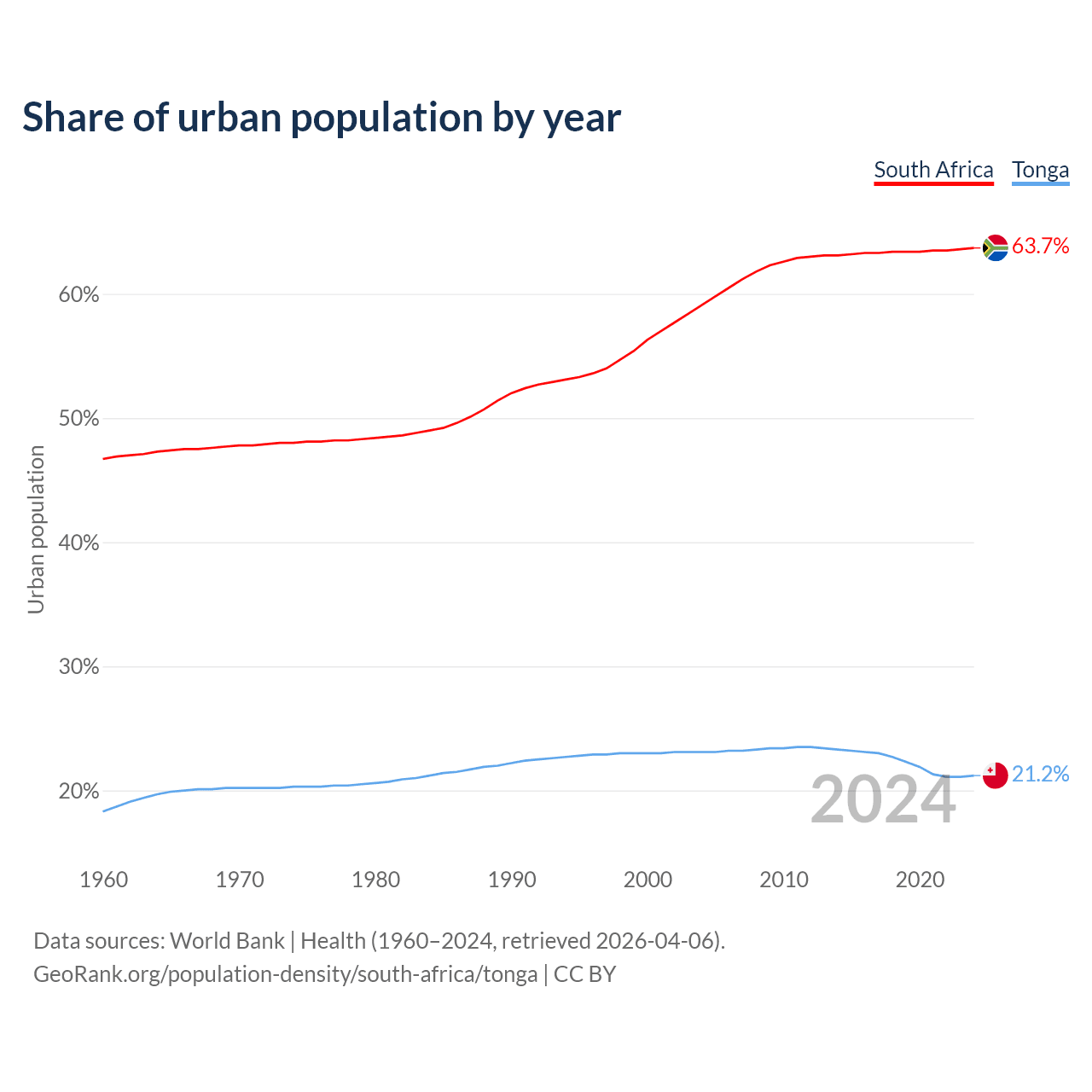 From 2004 to 2024, the share of urban population changed from 59.1% to 63.7% in South Africa and from 23.1% to 21.2% in Tonga.