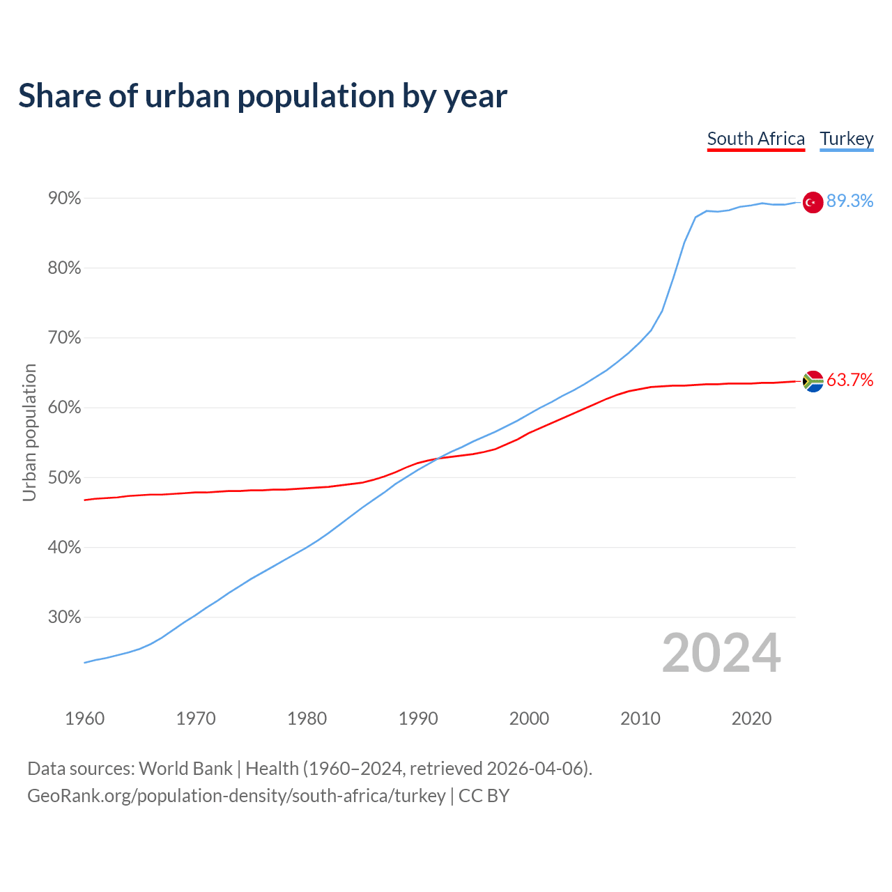 From 2004 to 2024, the share of urban population changed from 59.1% to 63.7% in South Africa and from 62.4% to 89.3% in Turkey.