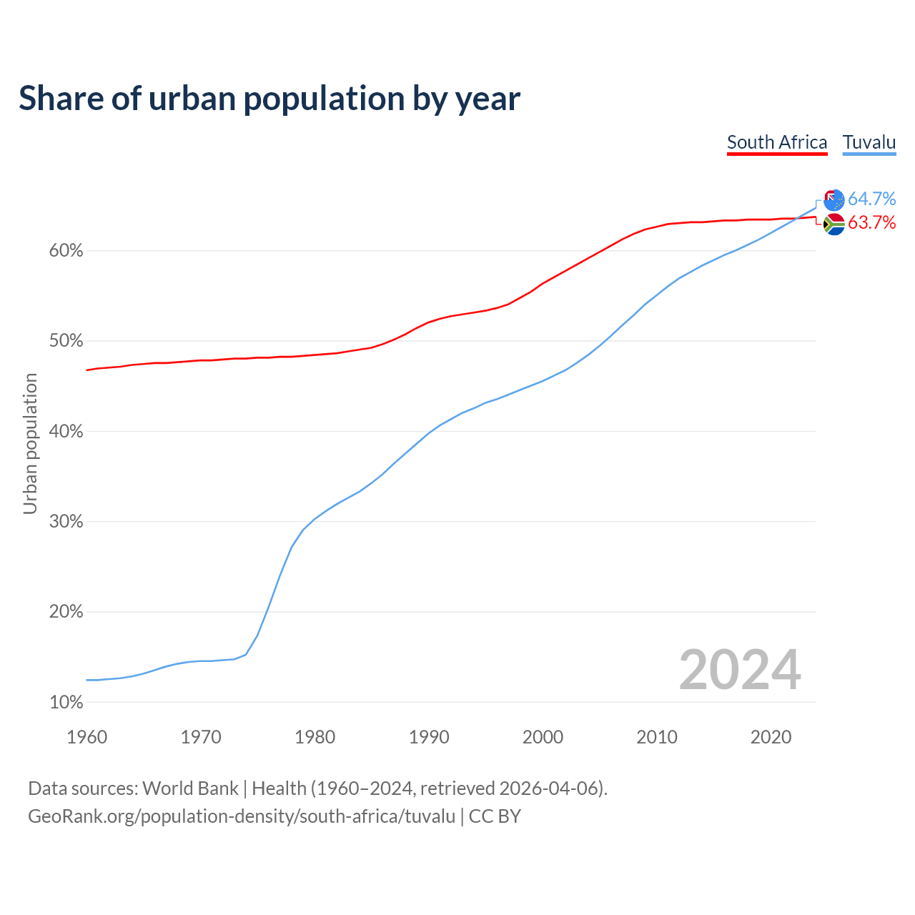 From 2004 to 2024, the share of urban population changed from 59.1% to 63.7% in South Africa and from 48.4% to 64.7% in Tuvalu.