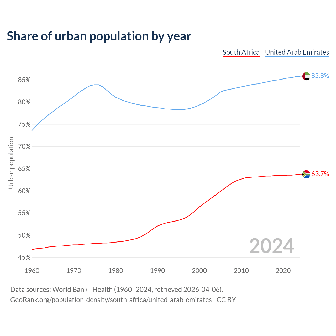 From 2004 to 2024, the share of urban population changed from 59.1% to 63.7% in South Africa and from 81.5% to 85.8% in the United Arab Emirates.