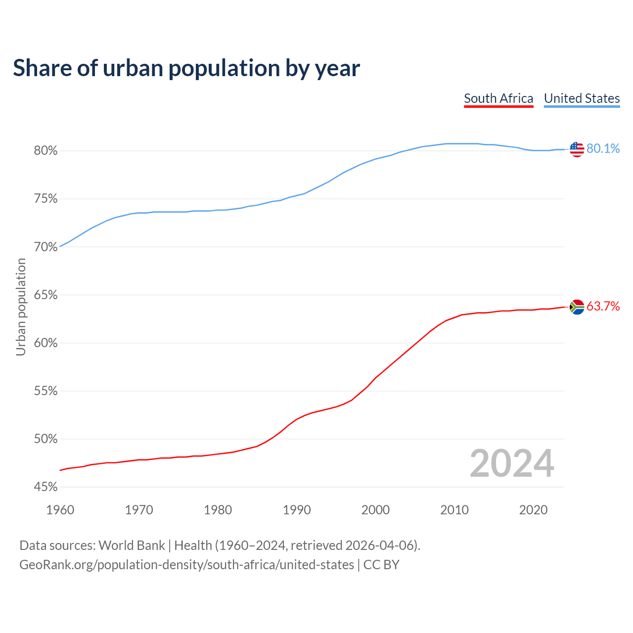 From 2004 to 2024, the share of urban population changed from 59.1% to 63.7% in South Africa and from 80% to 80.1% in the United States.