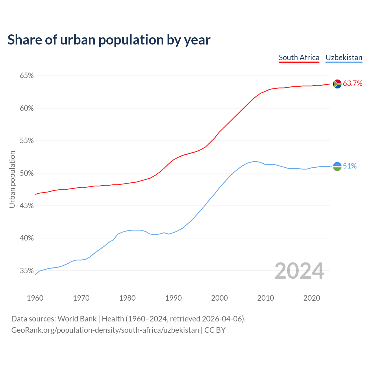 From 2004 to 2024, the share of urban population changed from 59.1% to 63.7% in South Africa and from 50.6% to 51% in Uzbekistan.