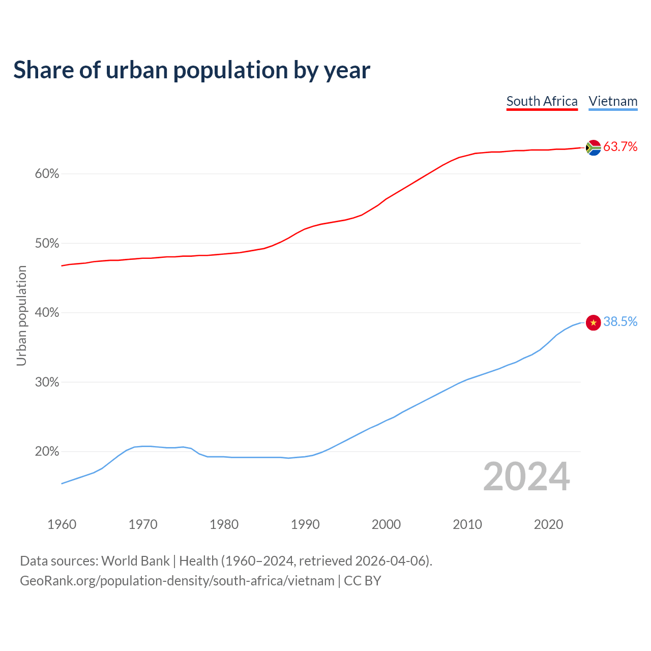 From 2004 to 2024, the share of urban population changed from 59.1% to 63.7% in South Africa and from 26.8% to 38.5% in Vietnam.
