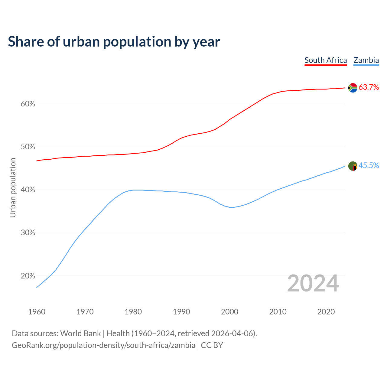 From 2004 to 2024, the share of urban population changed from 59.1% to 63.7% in South Africa and from 36.8% to 45.5% in Zambia.