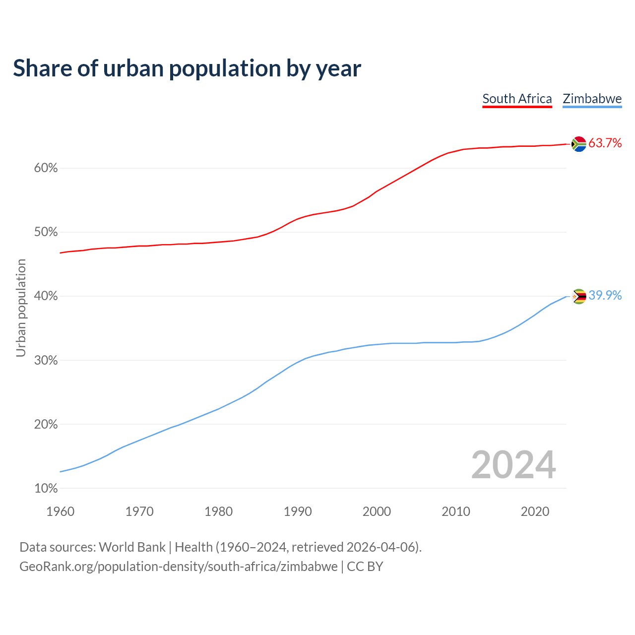 From 2004 to 2024, the share of urban population changed from 59.1% to 63.7% in South Africa and from 32.6% to 39.9% in Zimbabwe.