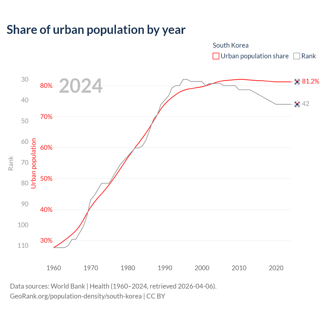 This chart shows the share of urban population in South Korea from 1960 to 2024: 27.7% lived in urban areas in 1960, 79.6% in 2000, and 81.2% in 2024.