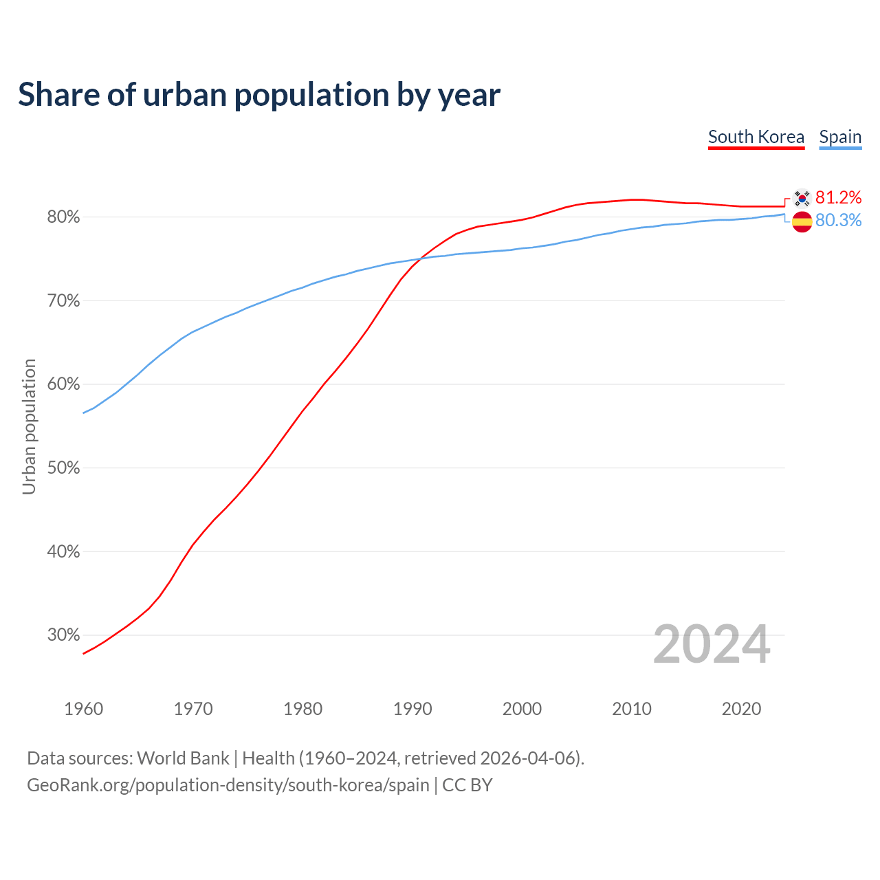 From 2004 to 2024, the share of urban population changed from 81.1% to 81.2% in South Korea and from 77% to 80.3% in Spain.