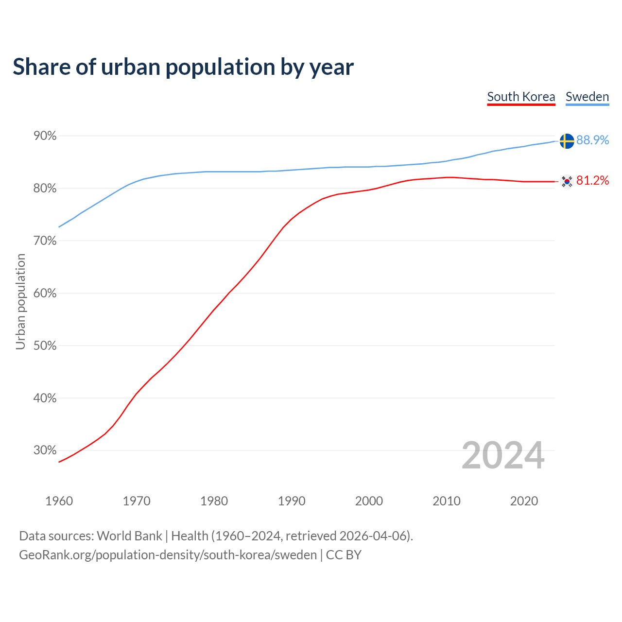 From 2004 to 2024, the share of urban population changed from 81.1% to 81.2% in South Korea and from 84.3% to 88.9% in Sweden.