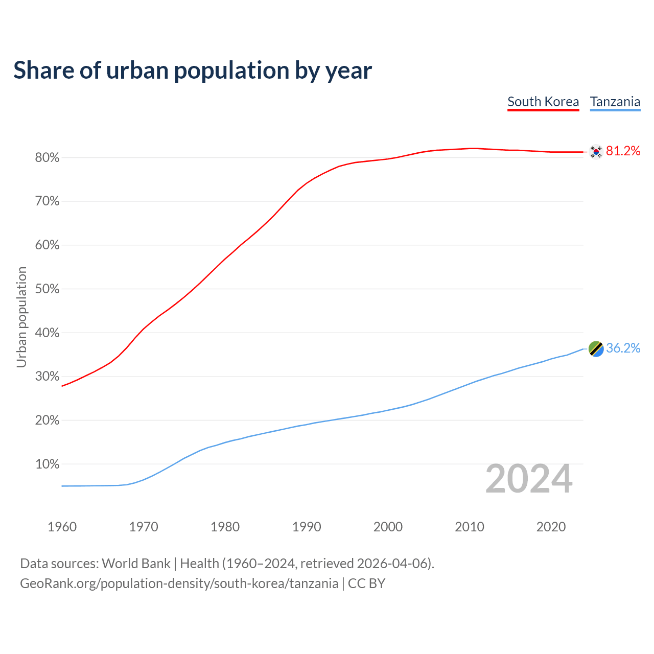 From 2004 to 2024, the share of urban population changed from 81.1% to 81.2% in South Korea and from 24.1% to 36.2% in Tanzania.