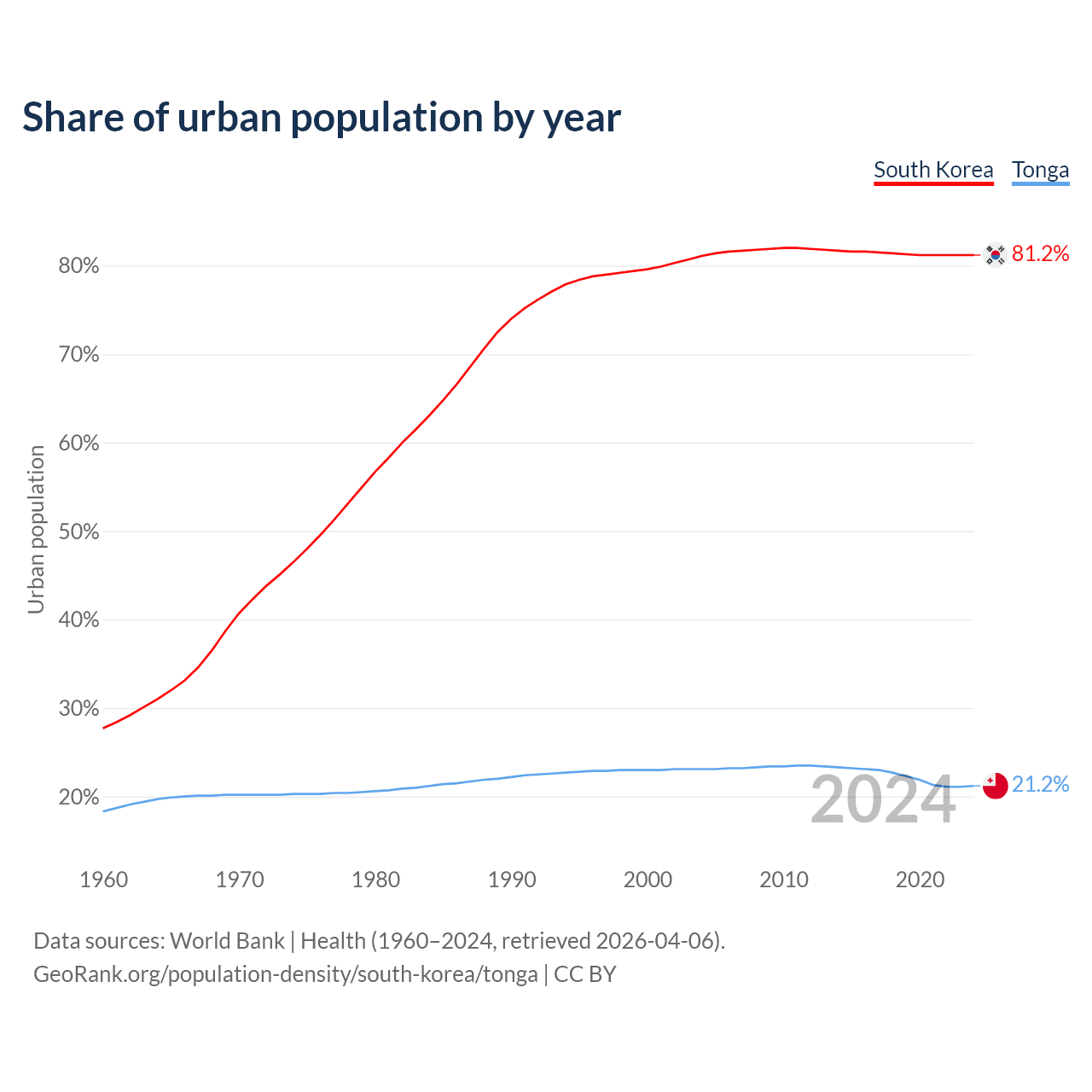 From 2004 to 2024, the share of urban population changed from 81.1% to 81.2% in South Korea and from 23.1% to 21.2% in Tonga.
