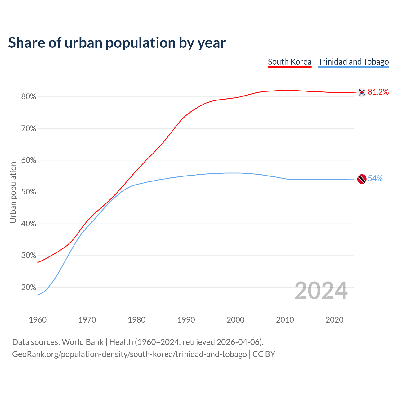 From 2004 to 2024, the share of urban population changed from 81.1% to 81.2% in South Korea and from 55.6% to 54% in Trinidad and Tobago.