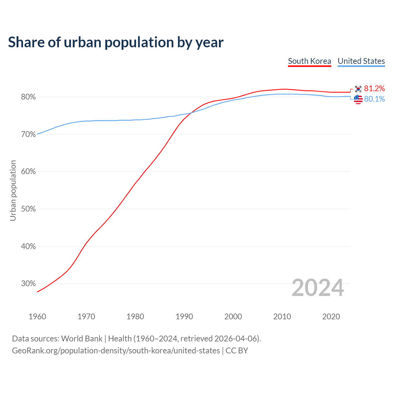 From 2004 to 2024, the share of urban population changed from 81.1% to 81.2% in South Korea and from 80% to 80.1% in the United States.