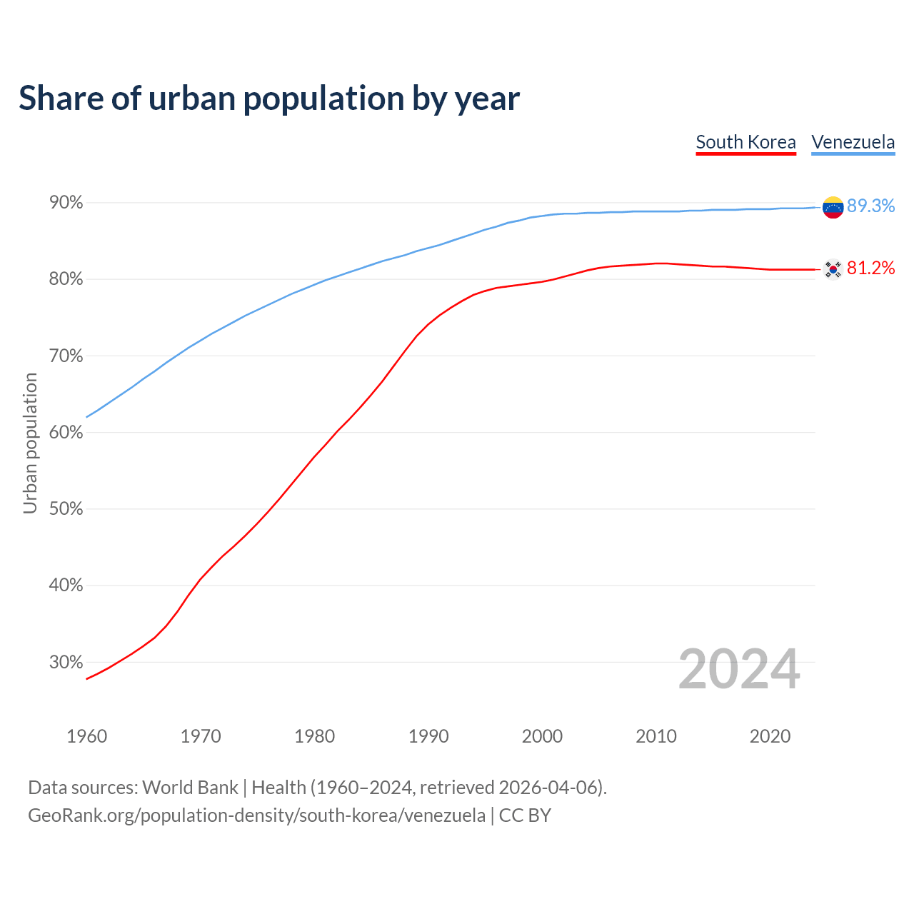 From 2004 to 2024, the share of urban population changed from 81.1% to 81.2% in South Korea and from 88.6% to 89.3% in Venezuela.